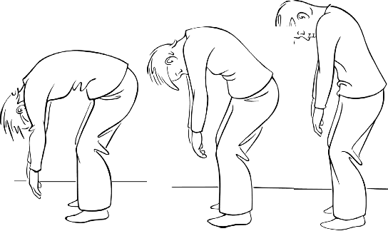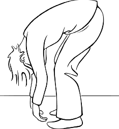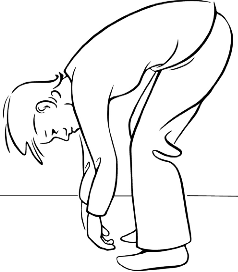 Another helpful grounding exercise is to let your head drop forward and gradually roll down until your hands touch the floor or you reach a point of discomfort. Your legs maintain the grounding stance as you bend at the waist as shown in Figure 5. It is important to breathe slowly and deeply during this exercise and to focus on relaxing as you exhale. Note that your knees remain bent throughout the exercise. It is also important to be aware of the position of your head. There is a strong tendency to raise your head so that you are looking at your feet or the floor (Figure 6). This creates tension in the neck and shoulders that needs to be avoided. You should be able to see the wall behind you from this position. If your eyes look toward your feet, there is tension in your neck. How far down you are able to go with your hands is a function of your overall body flexibility and has no impact upon the effectiveness of the exercise. Simply go down as far as is comfortable.
